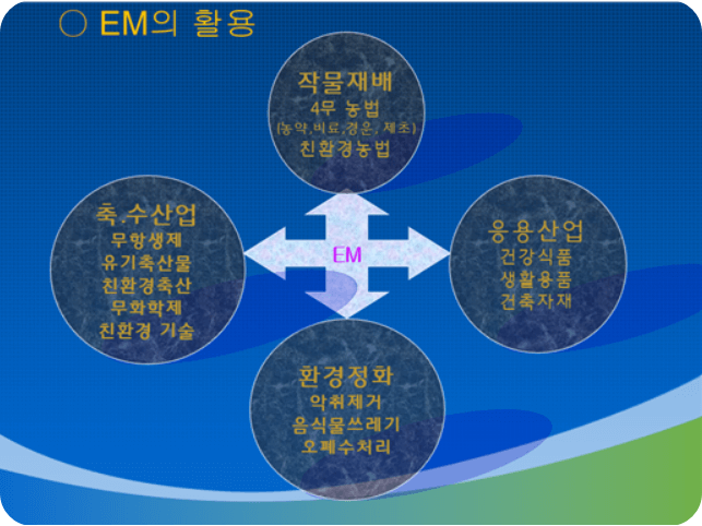 EM은 친환경적으로 만들어진 유용한 미생물이다. 농약 및 화학비료 사용으로 토양과 수질오염이 되고 있다. 축산 업으로부터 배설물과 퇴비숙성으로 인한 가스와 악취등이 발생한다. 가정과 사업장에서 배출되는 음식쓰레기와 오폐수등이 환경오염을 시키고 있다. 오염된 환경을 EM미생물을 활용하면 큰 효과를 이룰 수 있다.