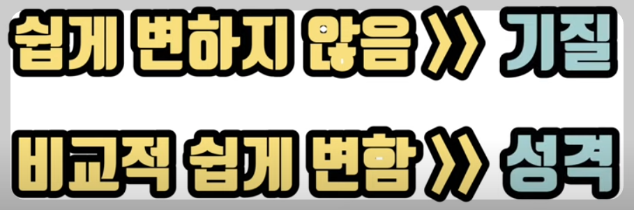 - 기질과 성격 부분에 잘 변하지 않는 부분과 잘 변하는 부분은 구분합니다.